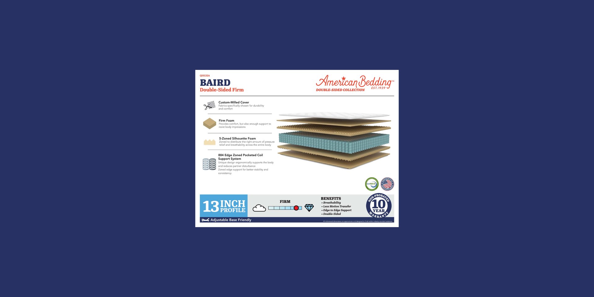 American Bedding was founded in 1939 on the belief that everyone deserves access to quality sleep, and continues to uphold this ideology by providing high-quality mattresses without the premium price tag. From their double-sided options to their antimicrobial, antibacterial mattresses, American Bedding offers a variety of options to provide you with the best mattress for your sleep needs!